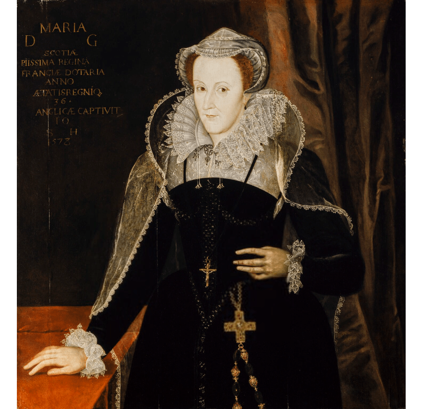 The choice of black velvet makes sense from both the appearance it would have given the gown and the colour reference to well known Mary Queen of Scots portraits. History painting became popular, and Mary was a popular subject in eighteenth and nineteenth-century paintings, where she is often also depicted wearing black.